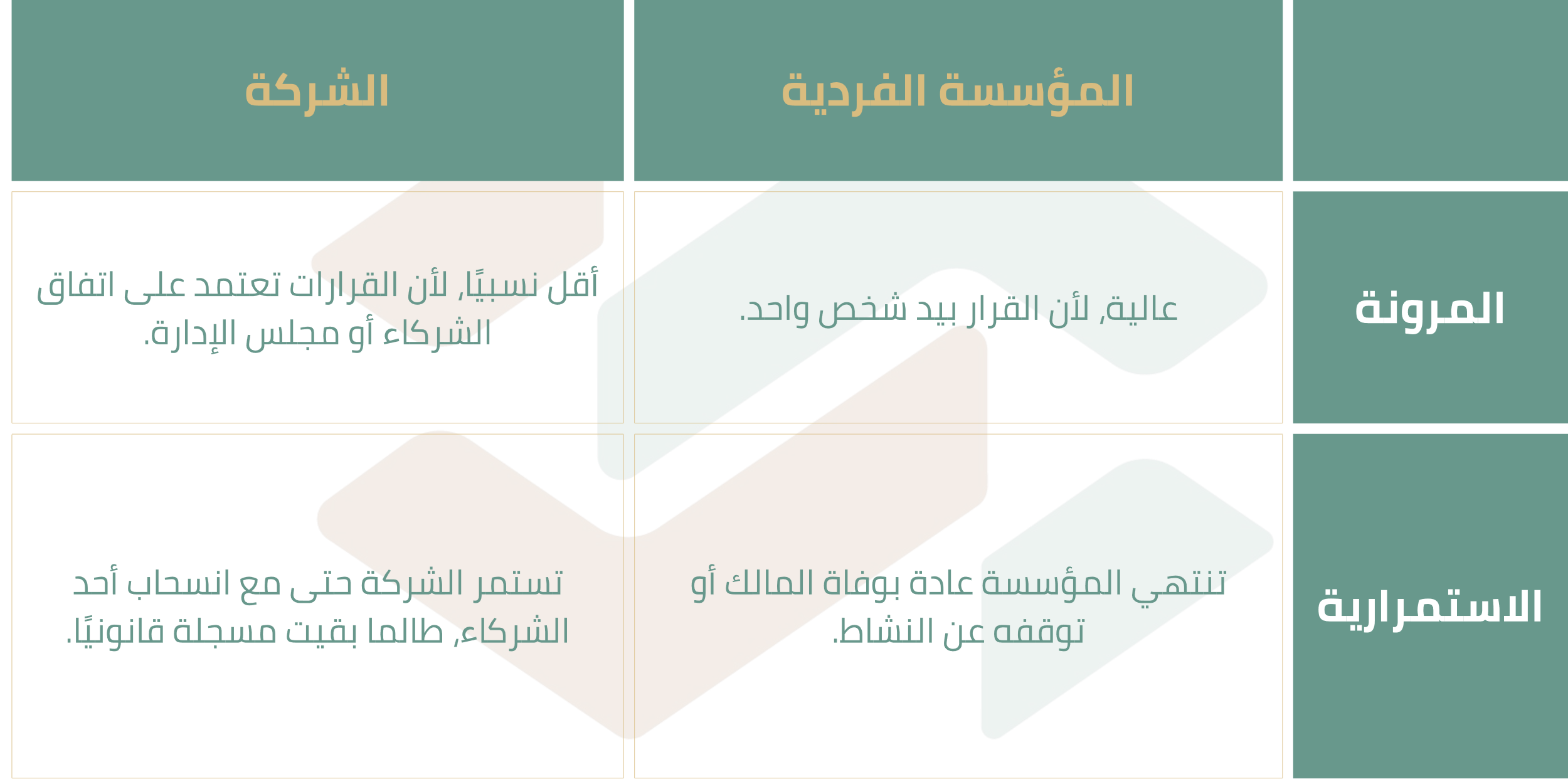 - الشخصية القانونية: كيان قانوني مستقل عن الشركاء.